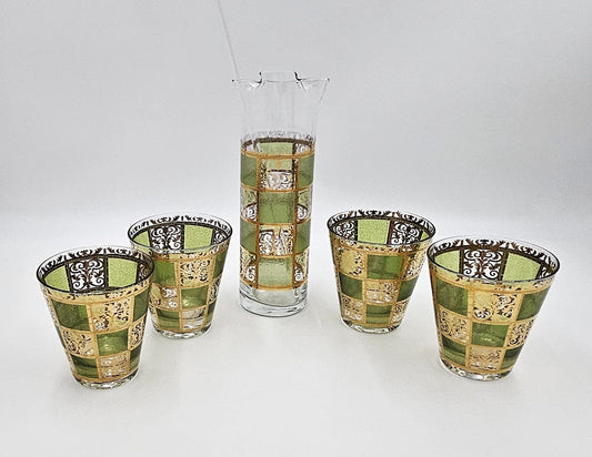 Superb Culver Prado Green 22k Gold Martini Pitcher Glasses Barware Set 1960s