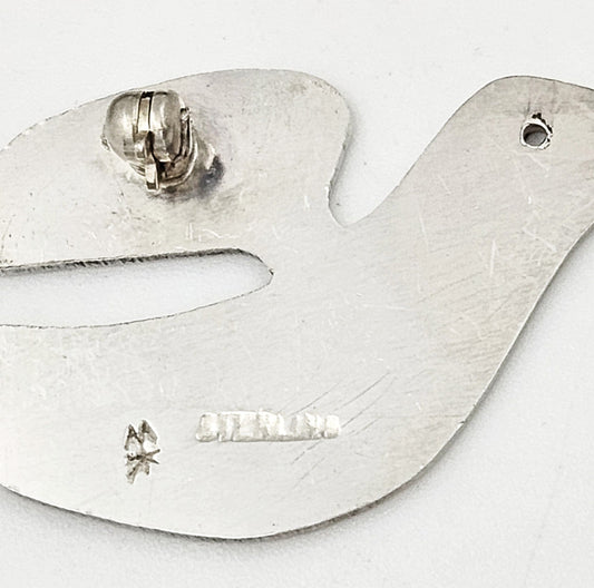 Designer Mik Stousland Sterling Silver Modernist Heart Love Bird Brooch 1980s