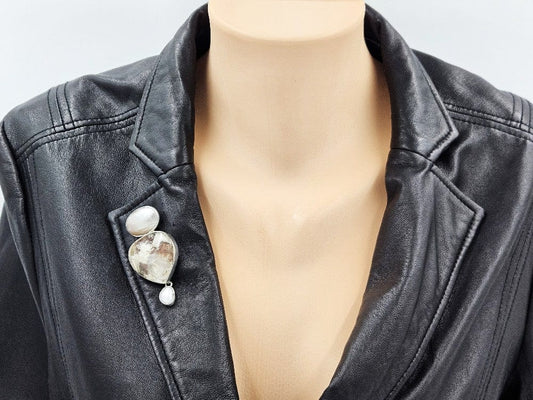 Amy Kahn Russell Sterling Carved Agate & Clear Quartz Leaf Brooch Pendant