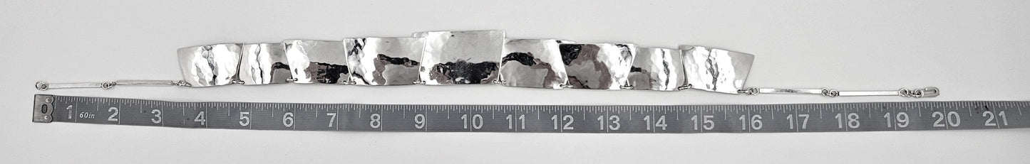 Necklace features 9 Trapezoid shaped pendants, of varying sizes, with a high gloss, hammered finish as the main feature of the necklace. Additionally, each side has 2 3D long bar links leading up to the clasp. Other than minor micro scratches here and there, overall it's in excellent condition with only minor wear. Please excuse the lines or reflections, as it's extremely shiny and hard to photograph.