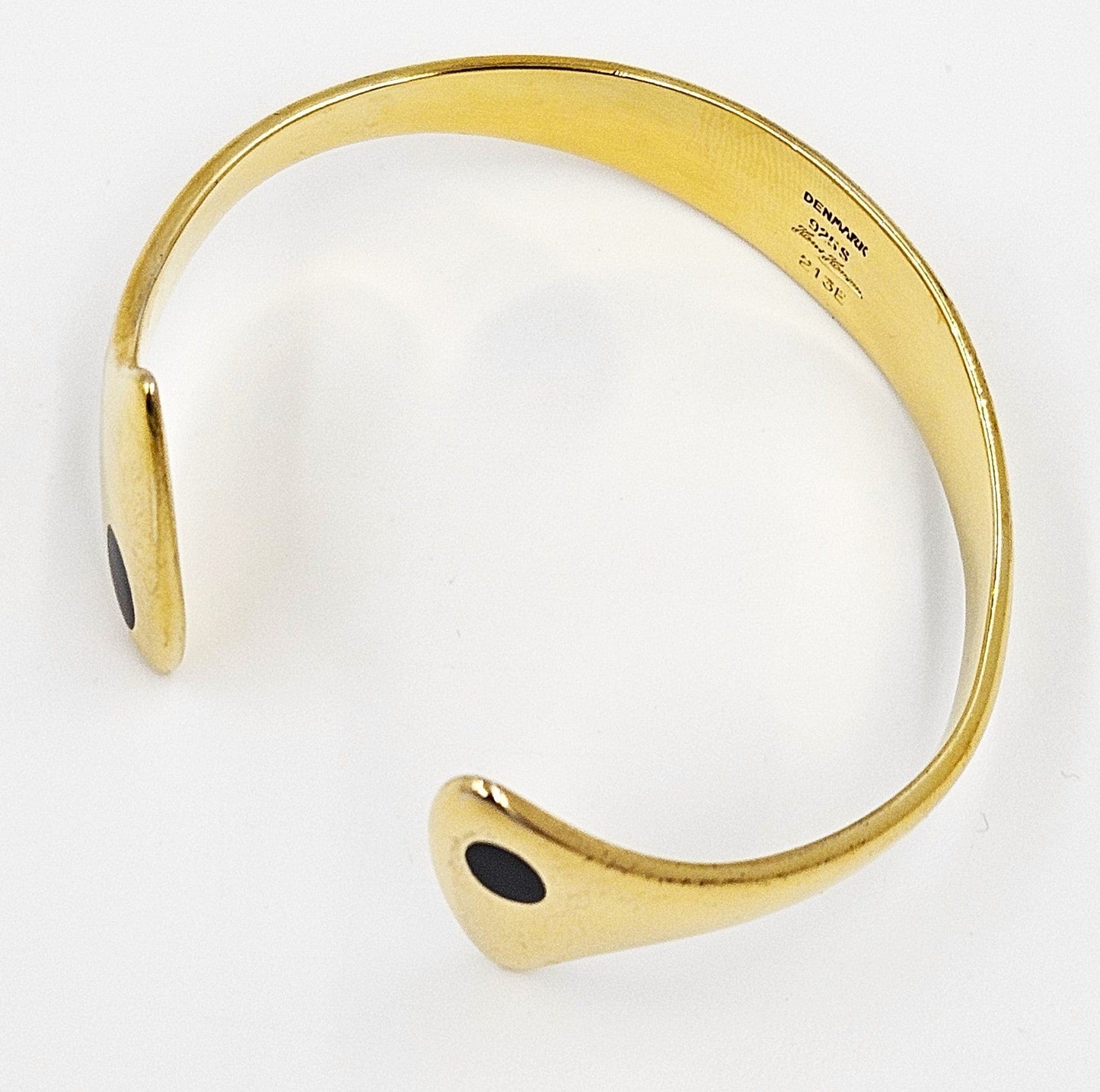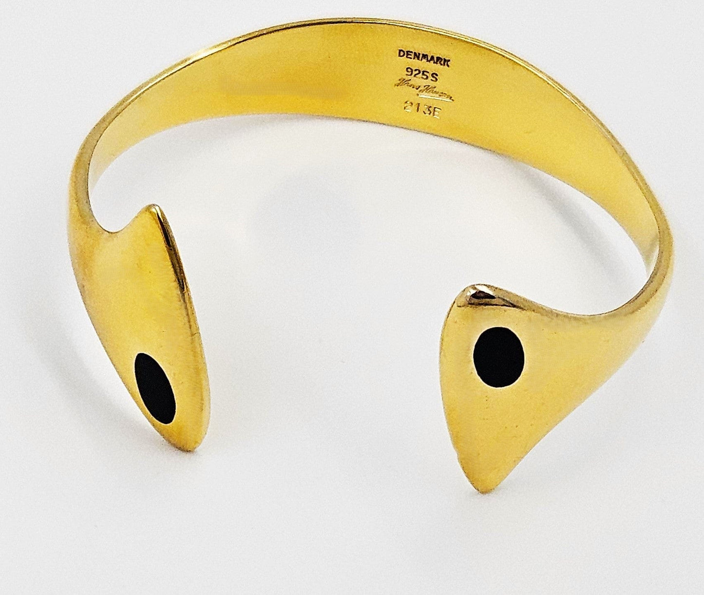 Stunning and rare gilded sterling silver and black enamel cuff by the incomparable Hans Hansen. Enamel is fully intact and bright, no dents or deep scratches. I have just paid a local goldsmith to replate it with 24k yellow gold, so there are no worn spots or missing gilding. Overall it's in great condition with only very light wear. Please excuse the lines or reflections, as it's extremely shiny and hard to photograph. Fantastic and highly collectible piece.
