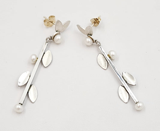 Designer Sterling 14k Gold Pearl Modernist Long Floral Leaves Dangle Earrings