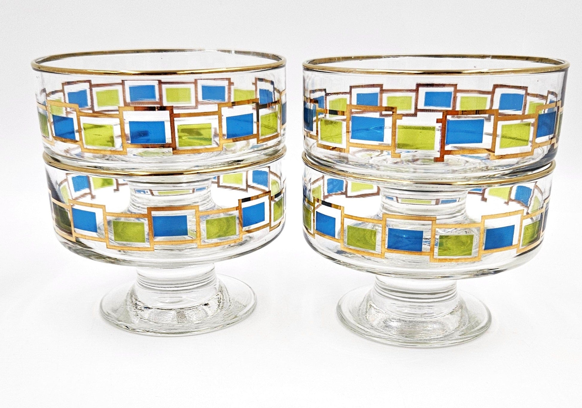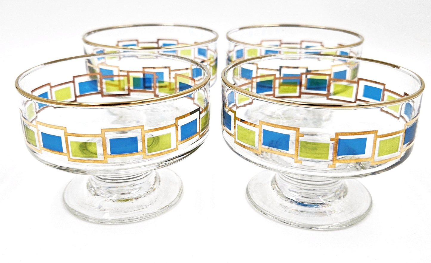 Fabulous set of mid century modern sherbet/dessert footed bowls. Adorned in a trendy 1960's mod pattern in lime green, blue and metallic gold pattern. There are no chips, cracks, or damage of any kind and the appliques are crisp, fully intact and bright. Some of the photos have reflections that make the gold rims look like they have missing patches, but they do not.