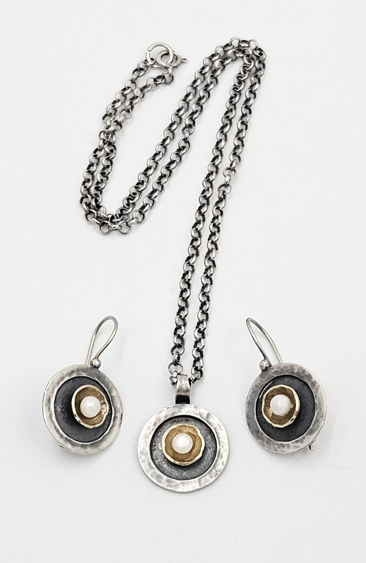Vintage Golan-Goldex Israel Sterling-14k-Pearl Modernist Necklace Earrings Set