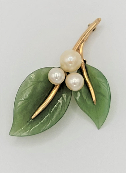 Vintage Gumps 14k Gold Pearl Green Jade Flora Fauna Brooch RARE Mint Condition!