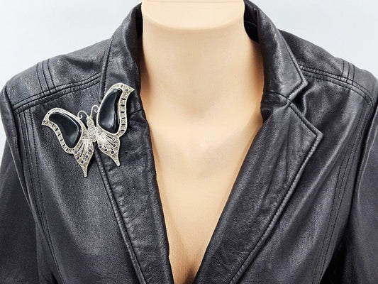 Vintage Designer HJ Sterling Marcasite Onyx Amethyst HUGE! Butterfly Brooch