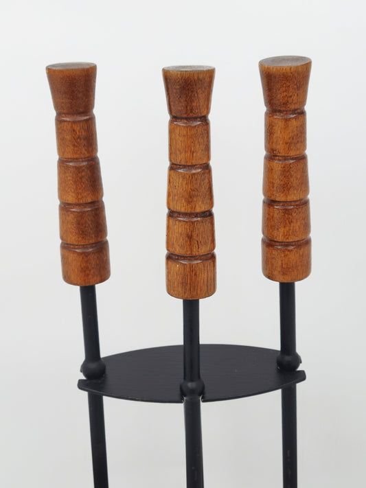 MCM Cast Iron and Carved Wood Danish Modern Style Fireplace Tool Set 1960s