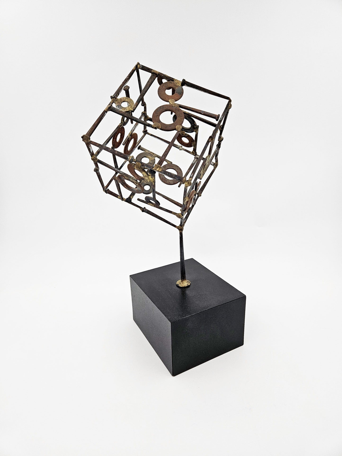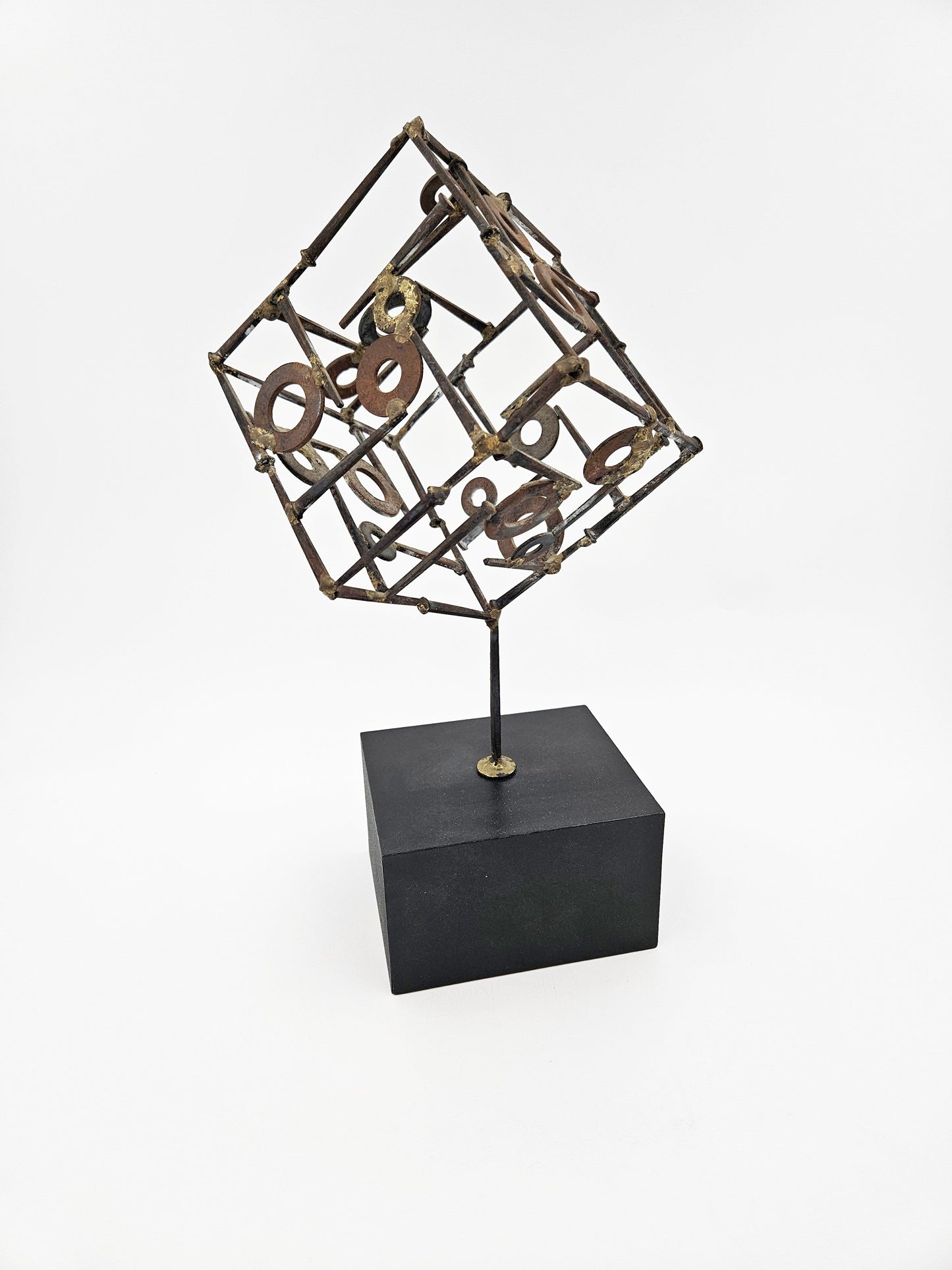 Well made vintage three dimensional cube sculpture on laminated wood base. Constructed of washers and mason nails and soldered standing on one of its corners on a bronze post. I've given it a heavy clear lacquer coat and added new black felt to the base. I don't believe the base is original to the sculpture. It's in excellent condition.