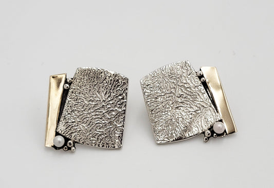 Bespoke Artisan Sterling 14K Seed Pearl Square Faced Textured Modernist Earrings