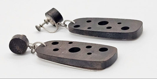 RARE Cavagnaro Sterling + Ebony Wood Abstract Mod XL 2-Part Earrings 1950s