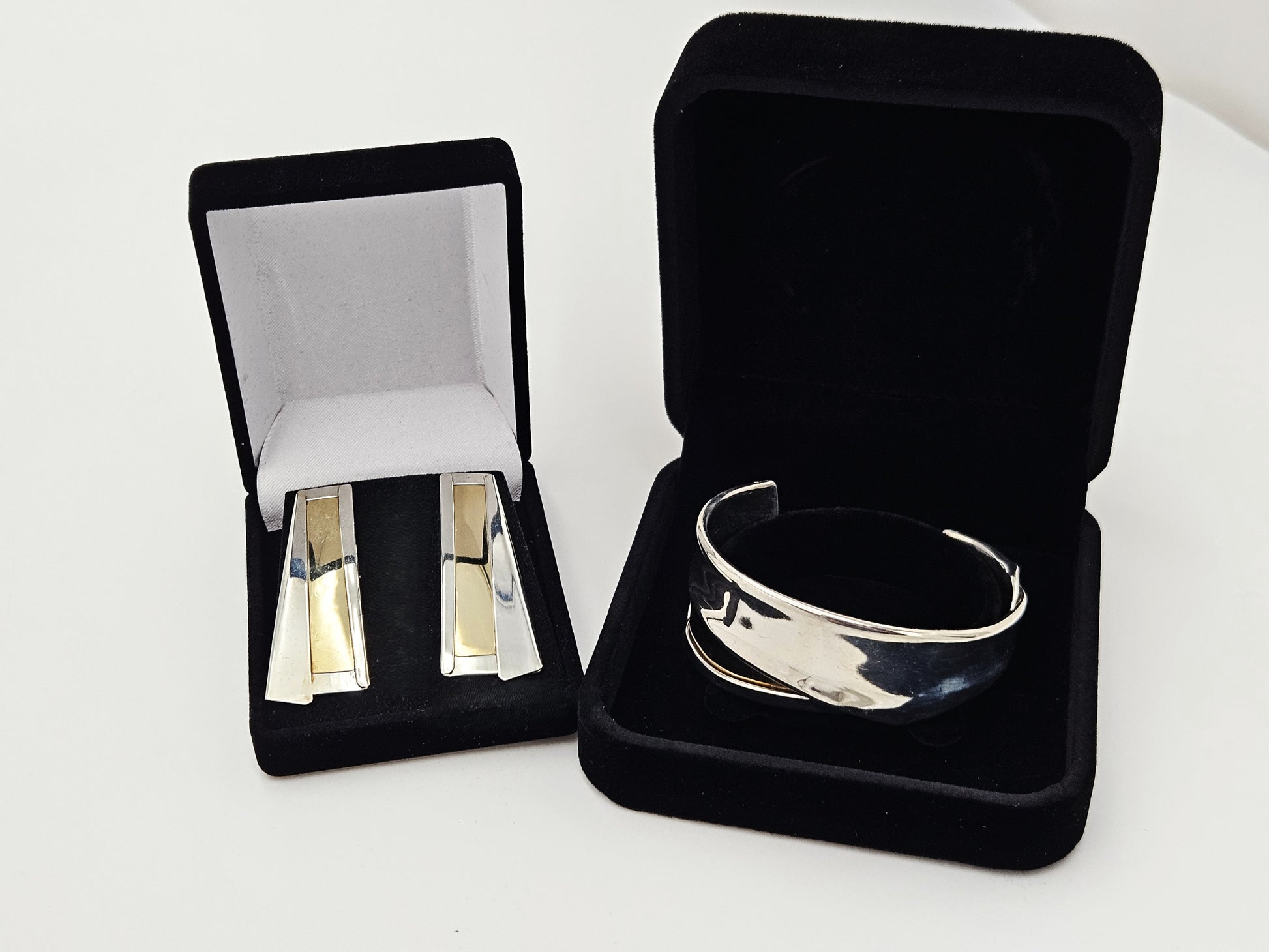 Gorgeous two tone sterling silver set from the 1980's. Set features a post modern style in white silver with accents of yellow gold over sterling. The set has recently been professionally polished and looks fantastic! Very shiny and hard to photograph, all the weird black lines and spots are just reflections and not damage.