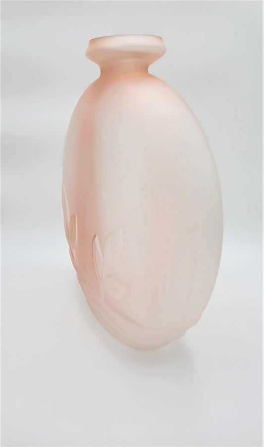 HUGE! Dolbi Cashier Art Deco Pink Satin Glass Vase Raised Floral Accents 1980s
