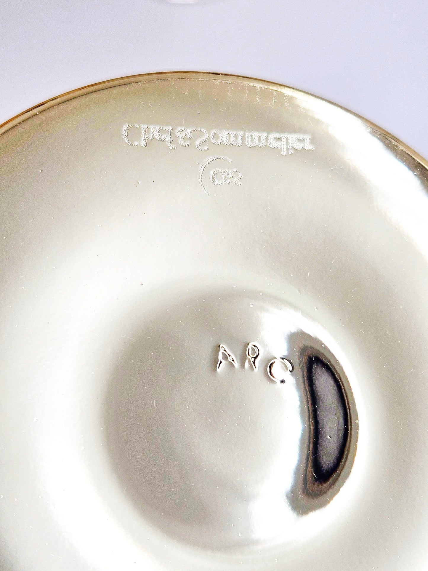 Gorgeous set of large mirror gold lame long stemmed goblets. The set is new old stock in the original box. The box has minor wear. Glasses are in like new condition with white logo appliques on one side and Moet white appliques on the back side. Extremely shiny with a mirror type finish and hard to photograph. Please excuse the lines or reflections.