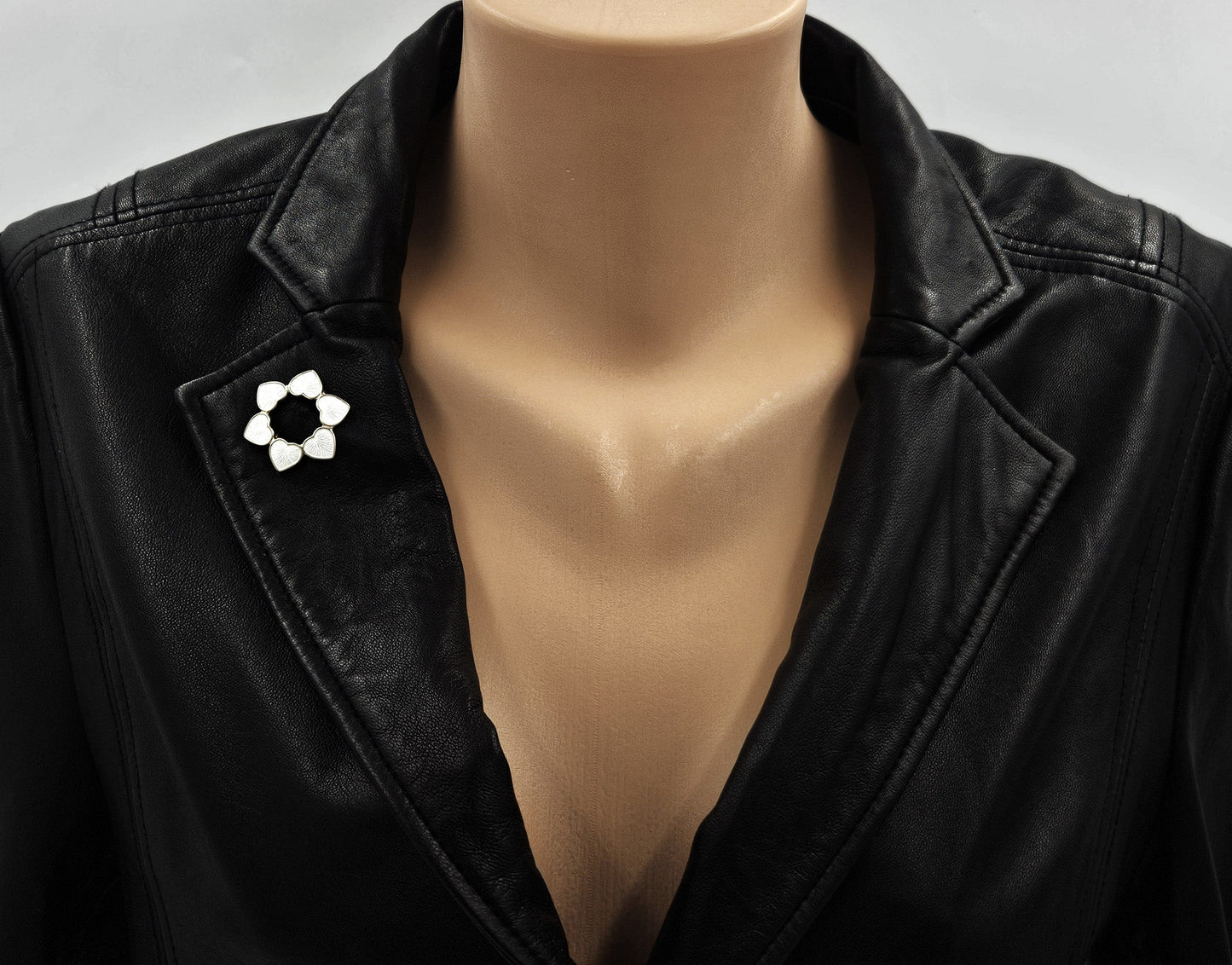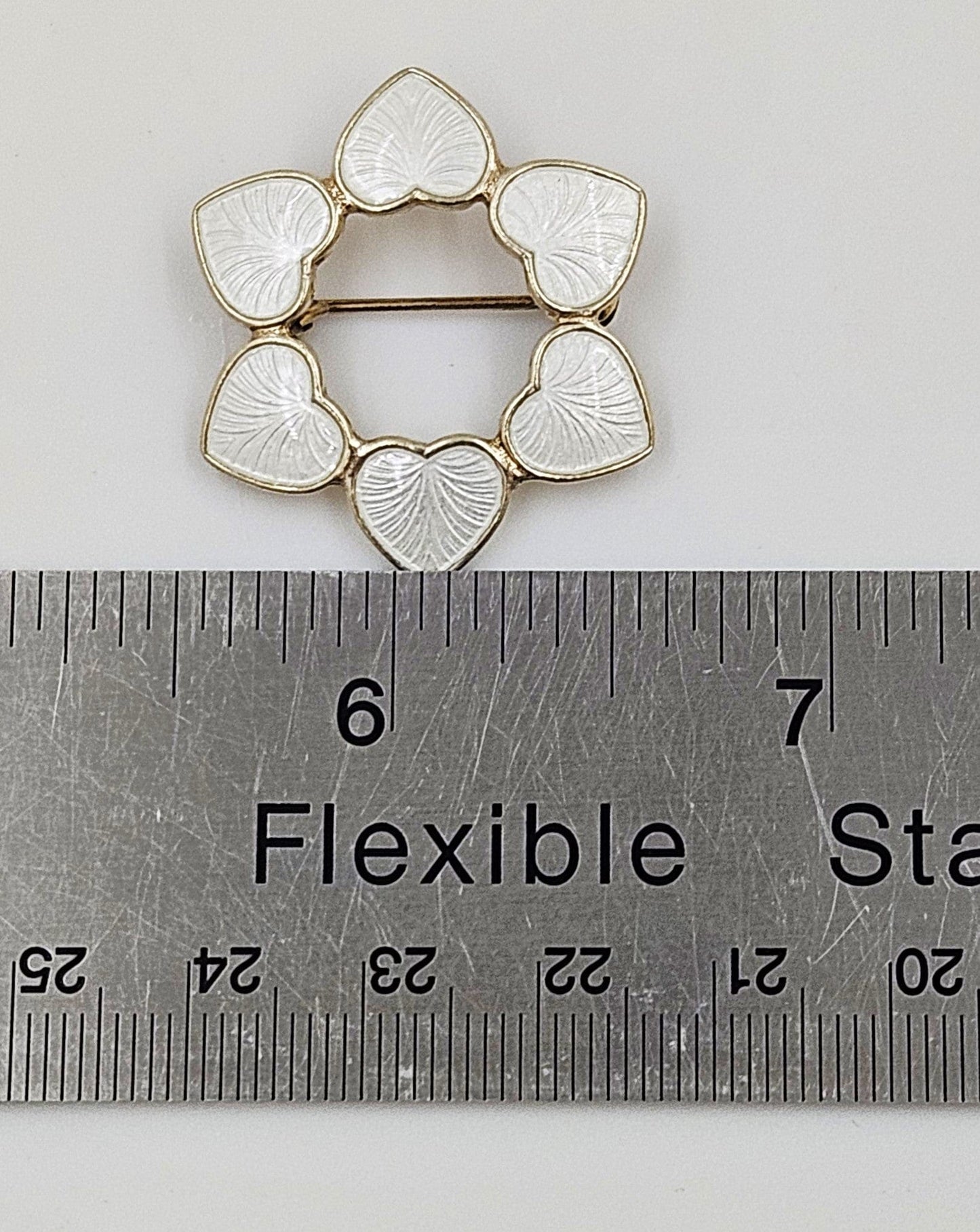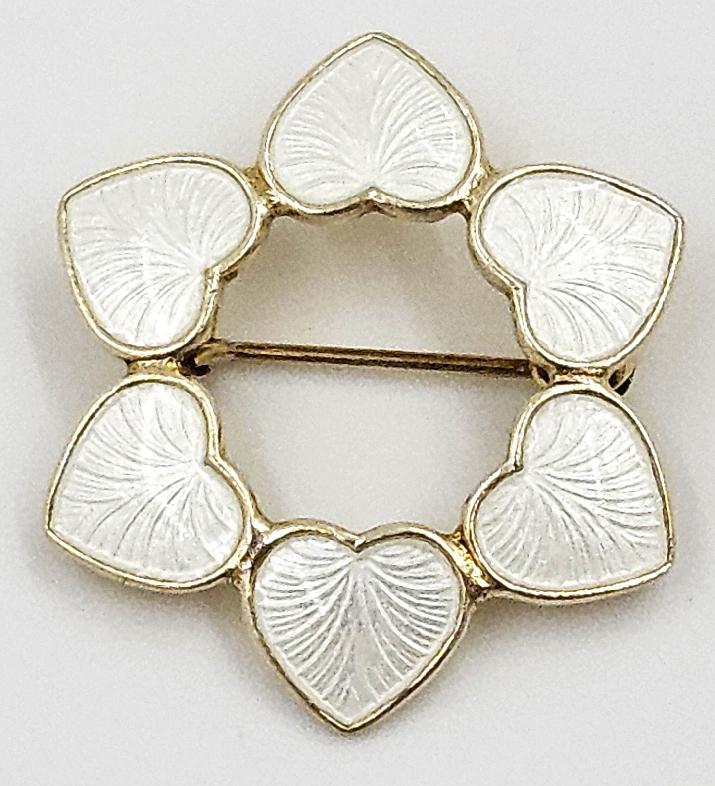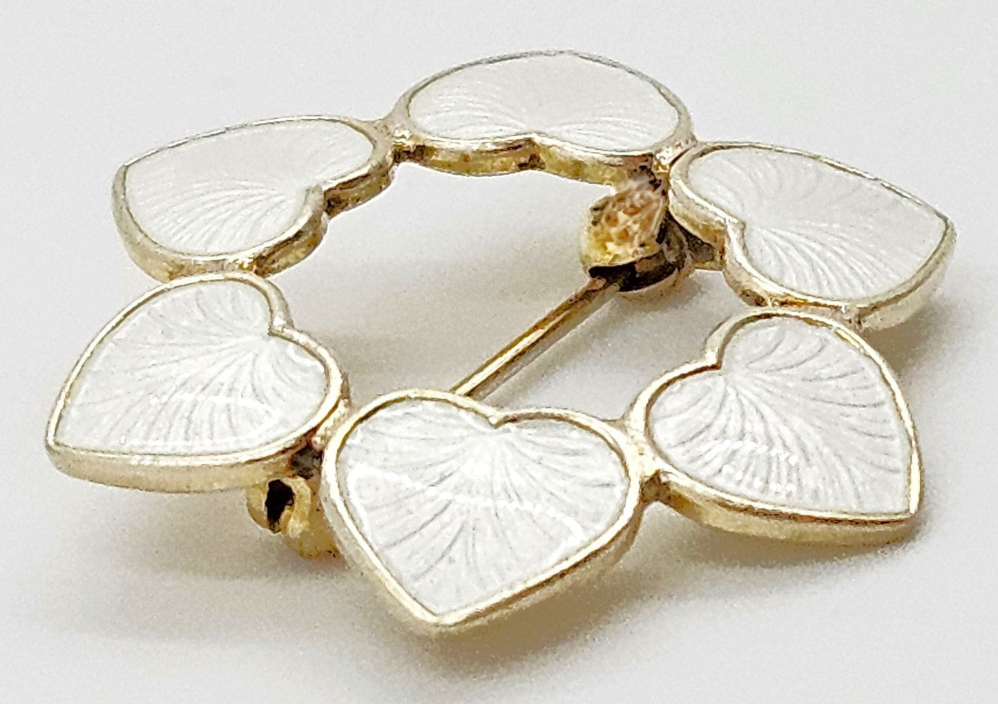 Lovely sterling silver brooch by renowned Volmer Bahner of Denmark. Brooch features white guilloche enamel hearts that have been connected to form the shape of a circle or wreath. Overall pin is in exceptional condition, with no damage of any kind to enamel and the backside has very minimal wear to the gilding comparable to age and love.  Enamel is extremely glossy and hard to photograph, please excuse the white lines and reflections.