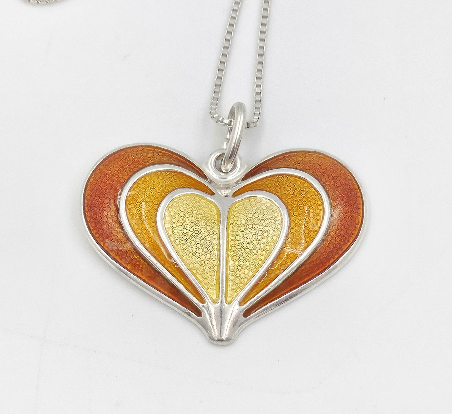 David Andersen Norway Sterling Silver Orange Yellow Guilloche Enamel Heart Pendant Necklace - Circa 1950s