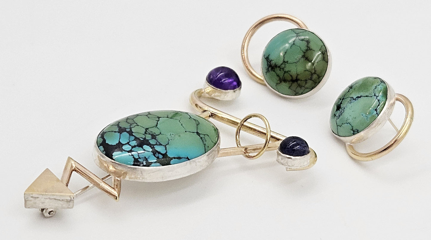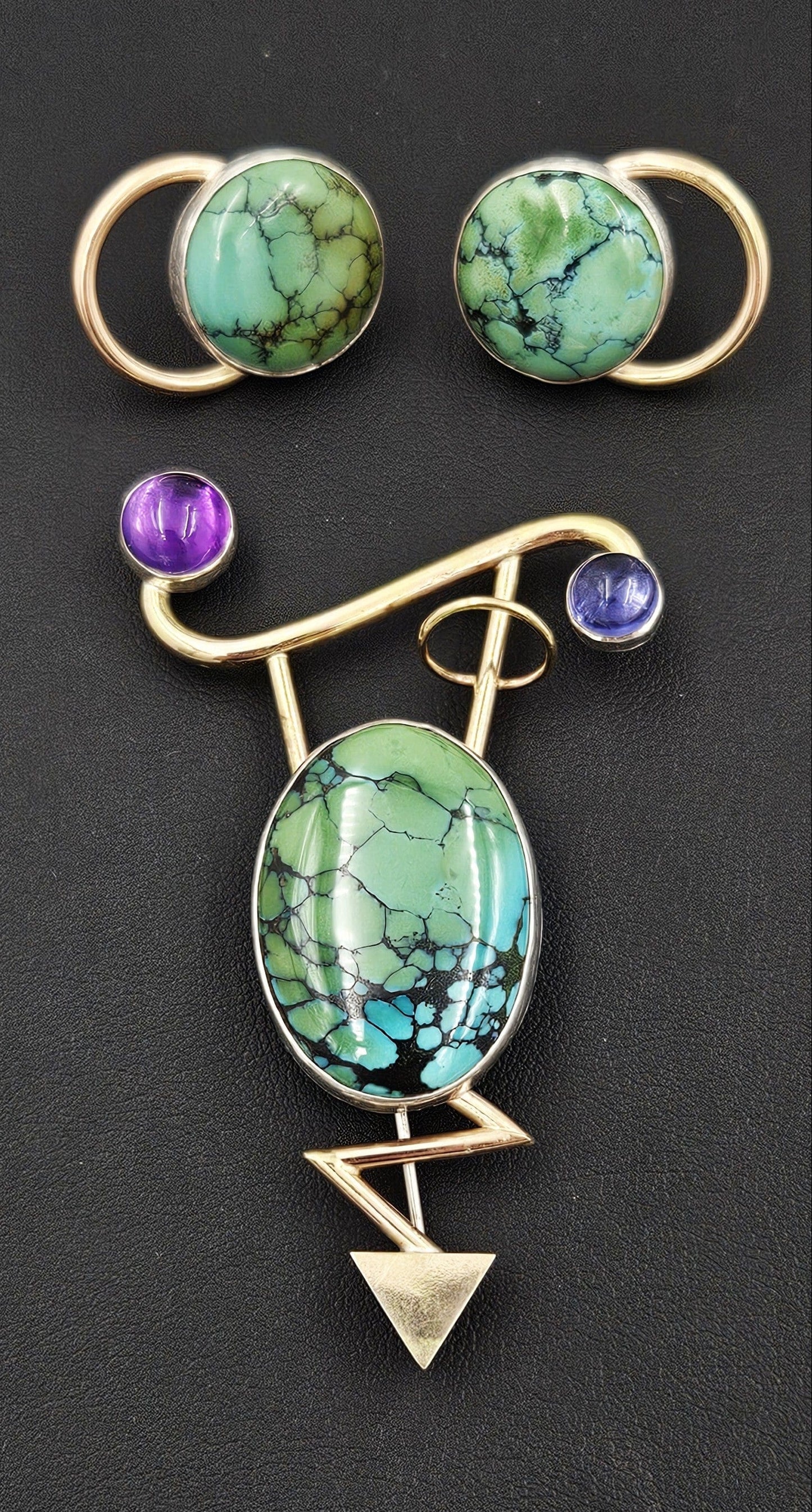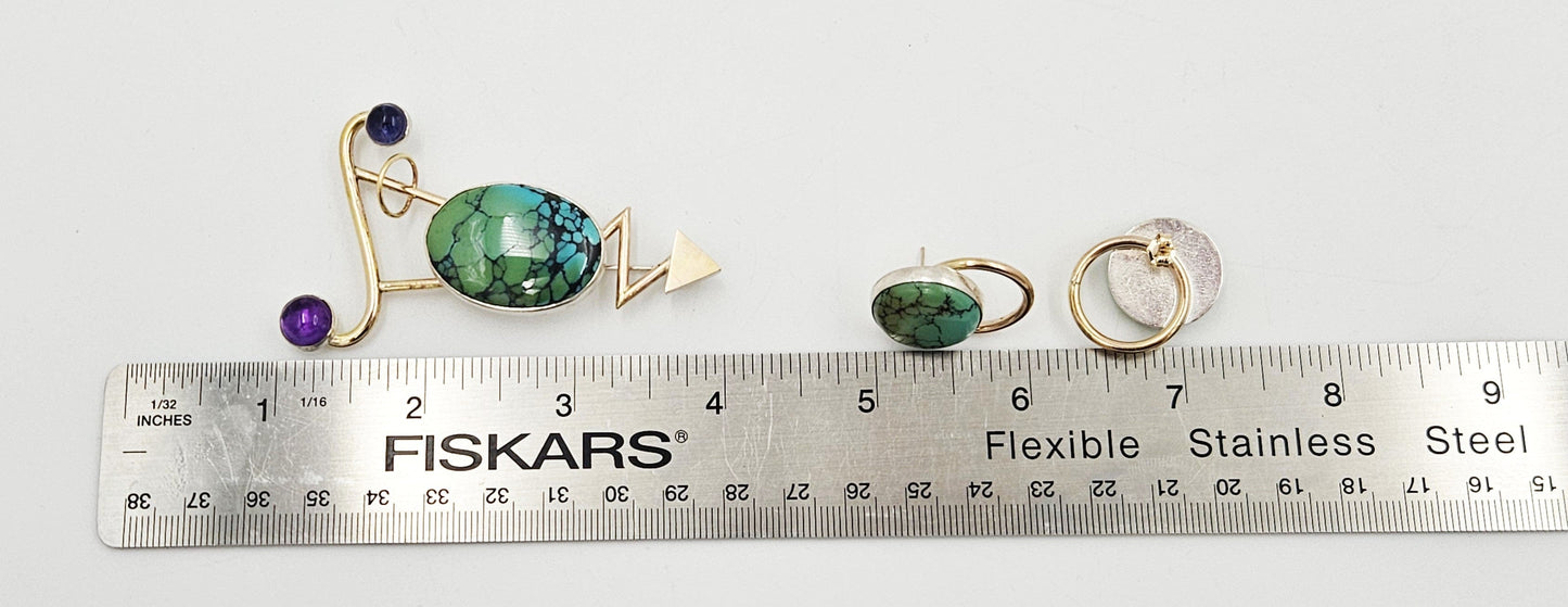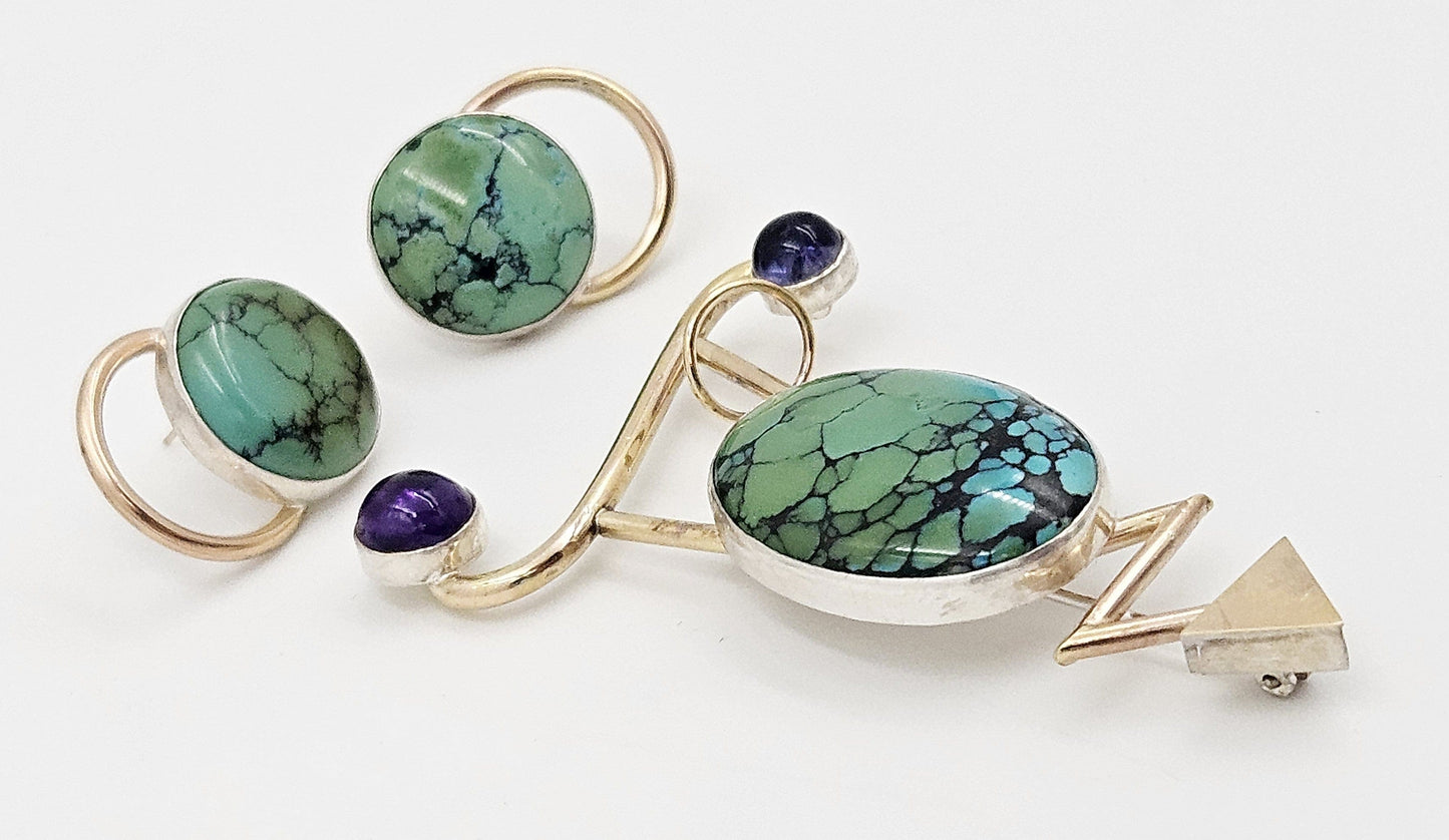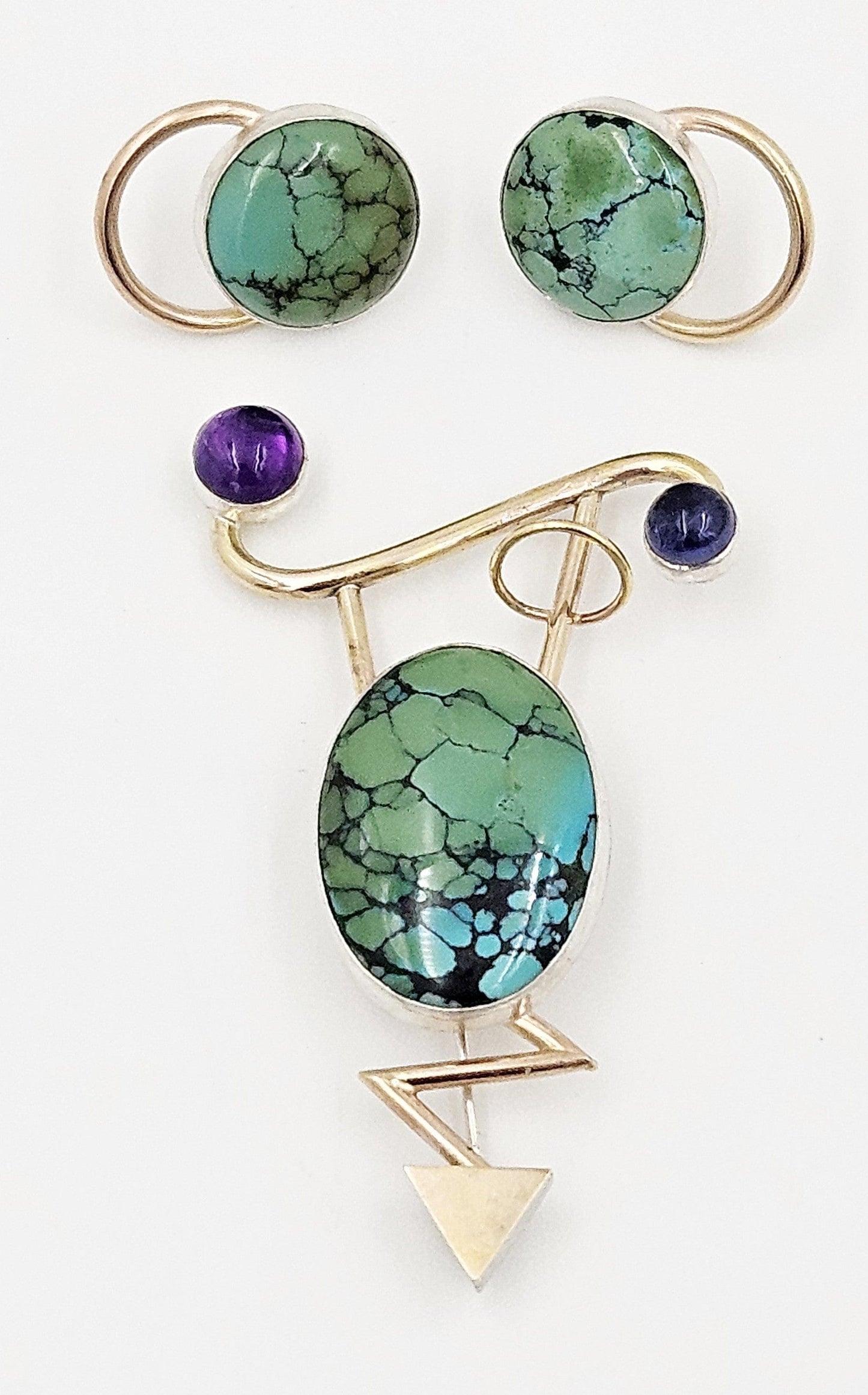 Her site states she only uses sterling and gold, and her work is award winning. This set is no exception. The set features a large brooch with matching earrings in sterling silver and yellow gold. Brooch is adorned with with polished amethyst and turquoise and the earrings just turquoise. All 3 pieces are in excellent to like new condition. Included with purchase is a converter so the brooch can be worn as a pendant if preferred. PLEASE NOTE THAT THE STEM PART OF THE PIN BACK MAY NOT BE STERLING SILVER.