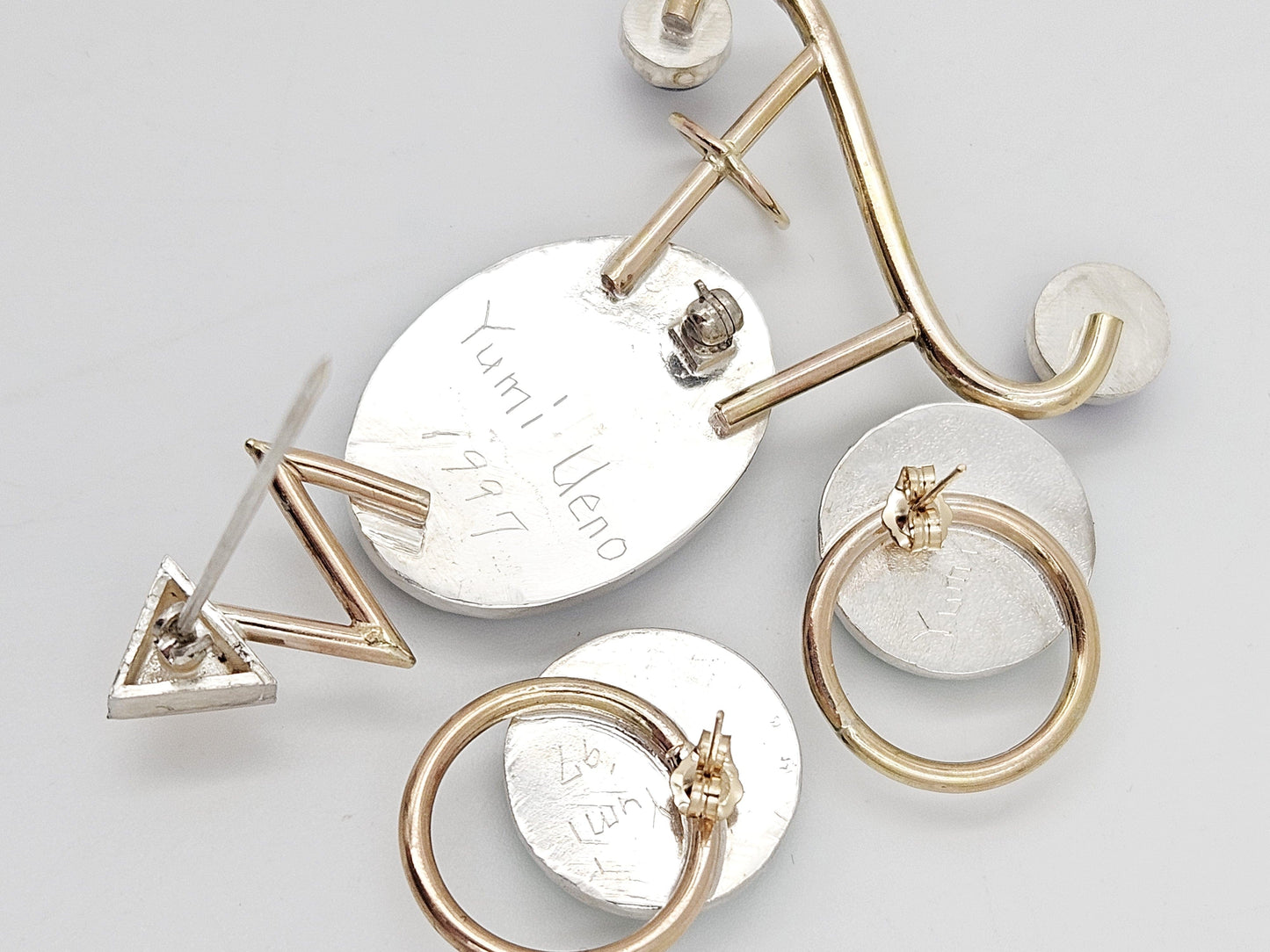 Rare Yumi Ueno Modernist Sterling 14k Multi-Stone Brooch Earrings Set 1997
