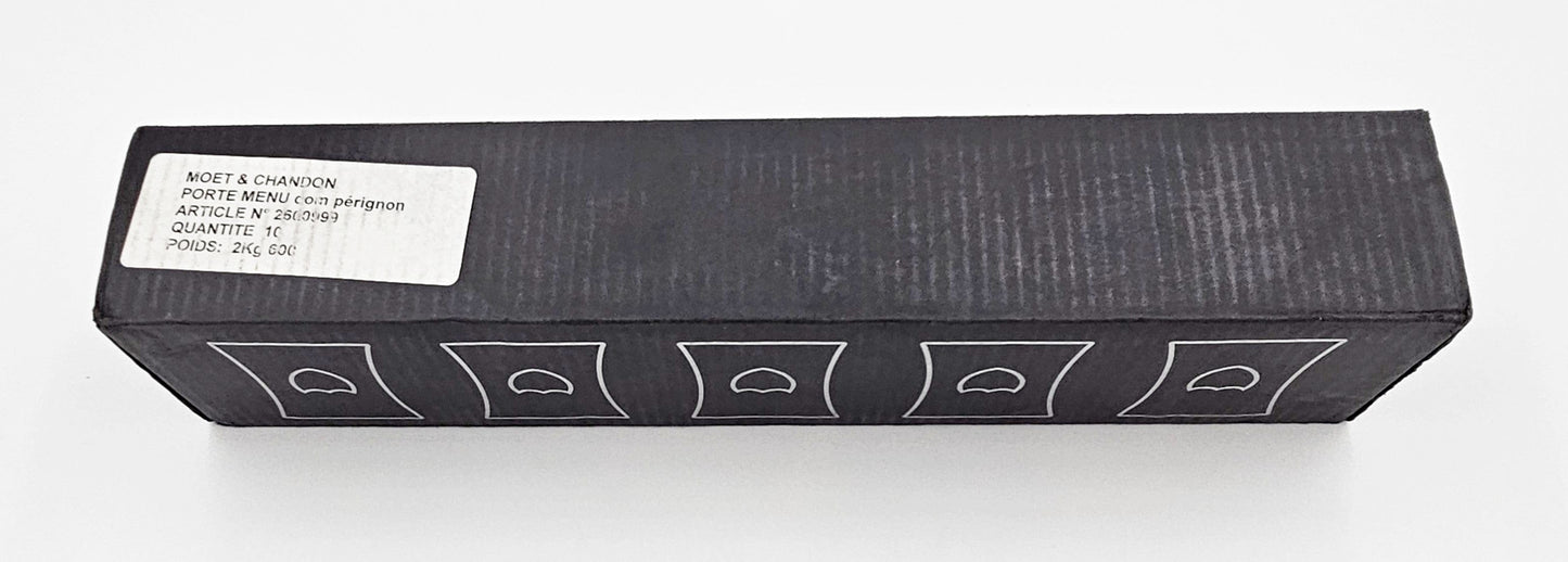 Rare - new old stock - full set of Pewter and brushed steel Moet and Chandon Dom Perignon place card / menu holders. Thick and heavy construction, features the signature raised "Shield" logo on each side along with Dom Perignon and signed on the bases with French designer Martin Szekely's signature. Produced in limited quantities as a special promotional set and distributed in the late 1990's early 2000's. The place card / menu holders looked to be unused and in excellent condition, with little to no wear. I have removed them from their original tissue paper for pics but they will be re-wrapped. The box do have shelf and tape wear.