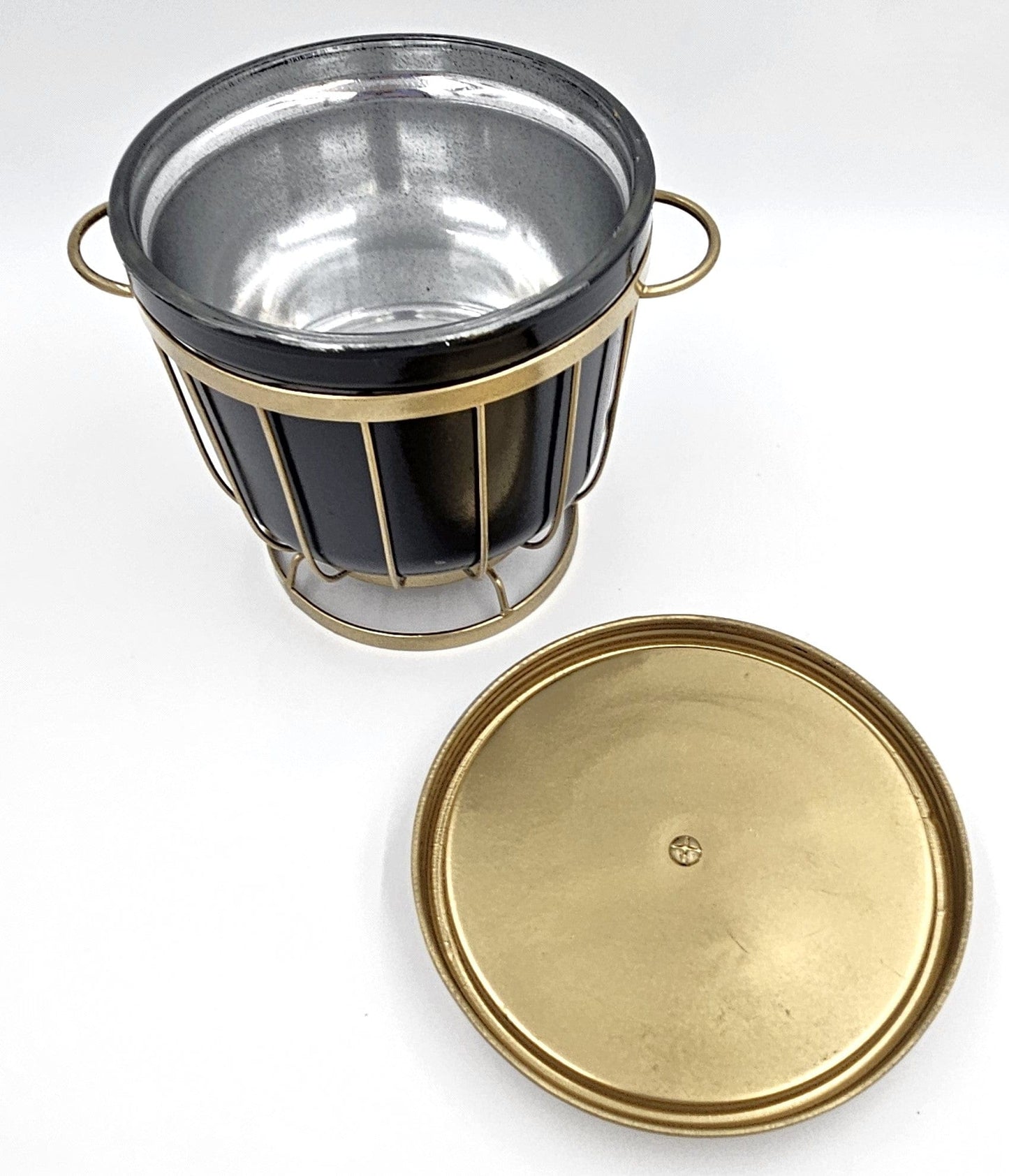 Fantastic vintage ice bucket from Georges Briard. Features a footed lacquered brass wire frame holder.  The lid features a hand-enameled round ceramic tile that is inset into a gold tone lacquered brass shell with a matching knob. The ice bucket frame and lid were made in Italy and marked as such. The bucket is made by Fire King and has a heavy solid metal shell with a clear glass inner liner. The set has been given a coat of clear lacquer that is UV resistant and non-yellowing, to insure no rusting or deterioration and many decades of enjoyment. The ceramic tile is semi-gloss and there are a few white reflective areas in the photos. There is no missing enamel or wear. There is one very shallow indent on the outer rim of the lid, please see photos.