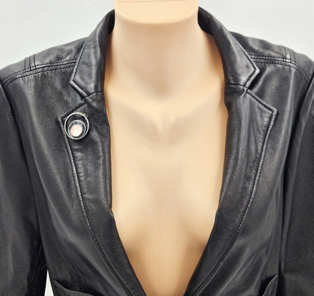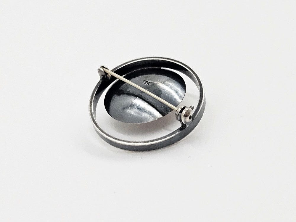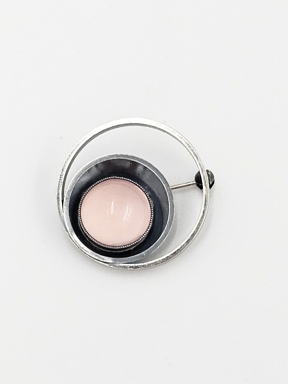 Beautiful and well-crafted dark sterling silver and rose quartz modernist Scandinavian style circle brooch. It is in excellent condition with no damage of any kind. Please excuse the white line or spots, they are just reflections. Included with purchase is a converter so it can be worn as a pendant if preferred.
